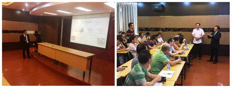 雷爱文教授主要致力于基于过渡金属催化的碳-碳和碳-杂原子键形成方法和机理研究。报告会上,雷爱文教授介绍了其课题组在发展新的自由基形成和偶联研究领域的最新进展,同时就如何通过同步辐射(X-ray Absortion)的方法捕捉实时反应过程中各种过渡金属价态的变化规律,为与会者提供了全新的思路。