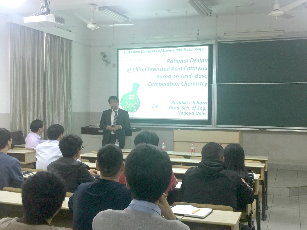 Ishihara教授的研究主要致力于于新型手性磷酸催化剂的设计及其在不对称催化中的应用。本次报告会,Ishihara教授重点介绍了课题组在新型手性磷酸催化不对称反应中的最新研究成果,主要包括利用路易斯酸协助手性磷酸(LBA)催化策略控制不对称[4+2]和[2+2]反应的Endo/Exo选择性以及对映选择性;新型手性双磷酸,手性焦磷酸在苯酚参与的不对称Friedel-Crafts反应中的应用;以及手性联萘衍生的磺酸金属盐(BINSA)在亚胺的不对称催化串联环化反应中的应用。