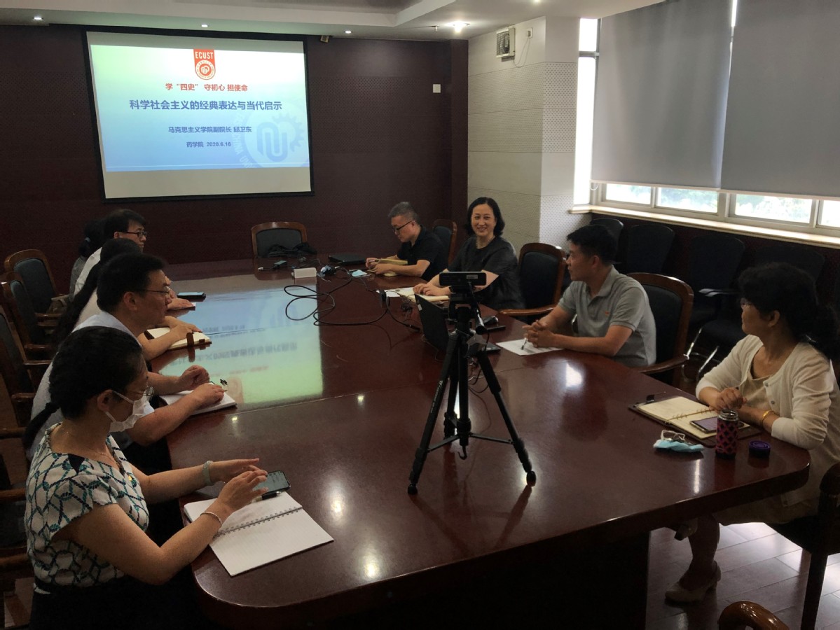 关于开展“四史”学习教育的安排,要求广大党员和教职工积极参加“四史”学习。随后,邱卫东从“马克思的科学社会主义理论及本质要义”,“科学社会主义的经典论断及其内在逻辑”和“基于科学社会主义经典表达的当代启示”三个层次,阐述了加强“四史”学习,深入理解科学社会主义的经典表达对当代的启示和重大意义。