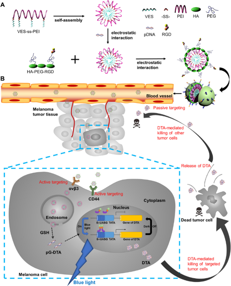 在此基础上,高峰团队设计构建了一种集透明质酸酶(HAase)敏感、谷胱甘肽(GSH)还原敏感、多重靶向、体内长循环为一体的智能纳米递药系统,联合LightOn系统成功应用于多种癌症精准治疗中。在研究中巧妙地设计了GSH还原敏感的VES-SS-PEI阳离子两亲性载体材料,作为内核胶束吸附基因;以及靶向肿瘤部分新生血管细胞和癌细胞的水溶性载体材料HA-PEG-RGD,形成功能性外壳包覆内核胶束。纳米粒经尾静脉注射进入荷瘤小鼠,由于EPR效应被动蓄积到肿瘤部位,通过纳米粒外壳上HA与RGD分别主动靶向CD44受体及αvβ3整合素高表达的癌细胞而被摄取,随后纳米粒外壳层经过肿瘤内透明质酸酶降解暴露出内核胶束。内核胶束通过溶酶体逃逸进入细胞质中,并受到细胞内较高浓度GSH响应降解,迅速释放光控白喉毒素光控基因(pGDTA),实现癌细胞的有效转染,通过蓝光照射,pGDTA中的pGAVPO基因形成同源二聚体,随后与pU5-DTA基因结合上游的UASG序列结合,激活DTA表达,从而杀伤癌细胞。纳米粒并通过RGD靶向肿瘤部位高表达αvβ3受体的新生血管,从而减少新生血管数量,抑制肿瘤转移。由于光控基因表达系统具有良好的时空可控能力,同时借助纳米递药系统,减少了DTA在正常组织中的表达,在保证最大化抗癌效果的同时最大限度降低毒副作用。相关研究融合了纳米技术与光控基因表达技术,为光控基因表达系统联合纳米递药系统在肿瘤治疗领域的应用研究提供了新思路和科学依据。