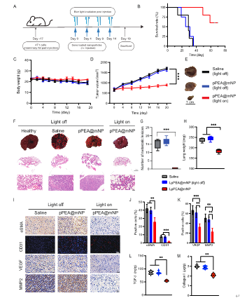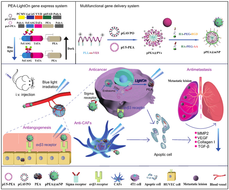 高峰课题组又有新突破,提出一种将光控基因表达铜绿假单胞菌外毒素靶向递送治疗乳腺癌肺转移的新策略。多靶向多功能纳米粒,可将LightOn光控基因系统质粒精准靶向递送至肿瘤细胞、肿瘤相关成纤维细胞和肿瘤新生血管细胞;在蓝光照射的控制下,该纳米递药系统能够时空可控地表达铜绿假单胞菌外毒素A,起到抑制肿瘤细胞、肿瘤相关成纤维细胞和抗肿瘤新生血管生成的作用;进而下调肿瘤部位相关细胞因子水平,改变肿瘤微环境,最终在精准治疗肿瘤的同时,突破乳腺癌转移难题。多靶向多功能纳米载体的靶向性、肿瘤环境响应释放能力和LightOn系统的时空可控性,赋予了该治疗策略提高疗效和减少毒副作用。相关成果以“Spatiotemporally controlled Pseudomonas exotoxin transgene system combined with multifunctional nanoparticles for breast cancer antimetastatic therapy”为题发表在国际学术期刊《控释杂志》上(J Control Release, 2023, S0168-3659(23): 00507-2.)。