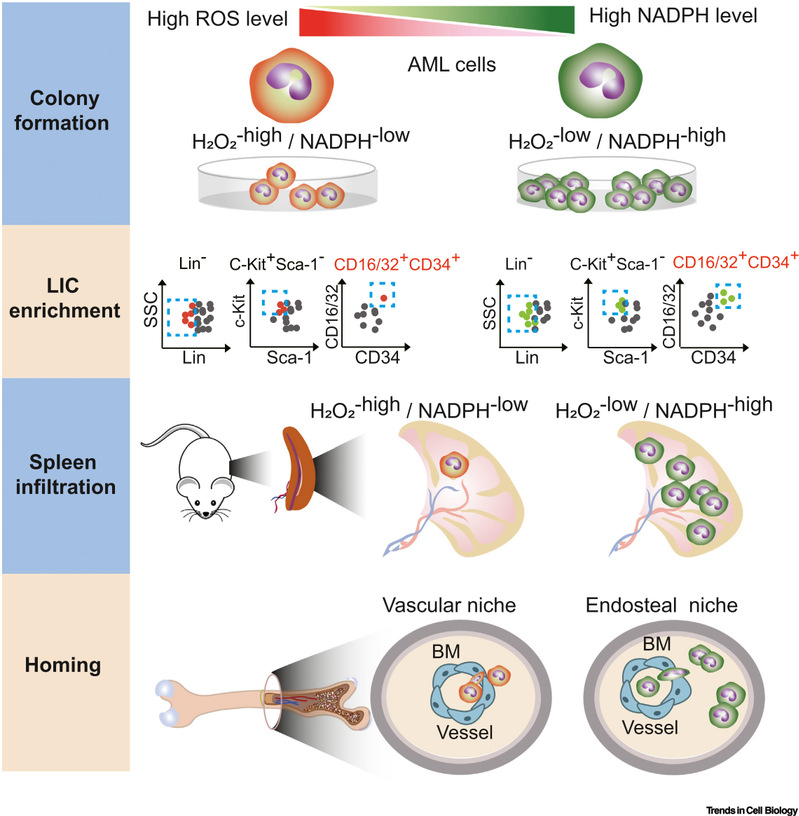 低水平的活性氧对于白血病起始细胞存活和维持静息状态至关重要。利用自主研发的过氧化氢探针HyPerion和NADPH探针iNap,研究团队证明了低的H2O2水平和高的NADPH水平细胞亚群富含更多功能性的急性髓系白血病起始细胞,这些细胞倾向于定位于骨内膜微环境,移植后白血病发病更快,总生存时间更短。苹果酸酶以及亚甲基四氢叶酸脱氢酶对于这群细胞的白血病形成能力至关重要。除了急性髓系白血病,低的活性氧和高的还原力也与急性或慢性淋巴细胞白血病的发生发展密切相关。