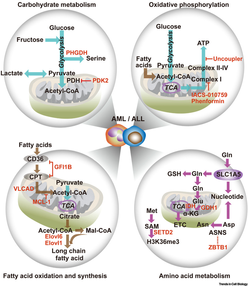 白血病细胞显示出能量和物质代谢的异质性。一般来说,氧化磷酸化对能量产生至关重要,在许多情况下是通过丙酮酸、脂肪酸、谷氨酰胺和支链氨基酸提供燃料。在急性髓系和淋巴细胞白血病中,抑制线粒体呼吸可解除对化疗药物如阿糖胞苷的抵抗,其中丙酮酸脱氢酶等是潜在的治疗靶标。除了氧化磷酸化,高的糖酵解活性也支持白血病发生发展。对于脂肪酸代谢,无论分解还是合成途径都驱动白血病的发生。此外,氨基酸和异柠檬酸代谢异常通过改变核苷酸与脂肪酸合成、表观遗传修饰等机制发挥了促进白血病发生的作用。这些代谢途径具有密切的联系,在白血病中,抑制葡萄糖氧化通常会代偿性地增加脂肪酸氧化,反之亦然。在葡萄糖/丙酮酸和脂肪酸之间选择底物不仅决定了能量生产的效率,而且还决定了活性氧的水平。