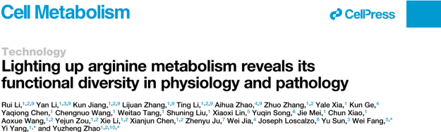 、生物反应器工程国家重点实验室、上海市细胞代谢光遗传学技术前沿科学研究基地赵玉政教授、杨弋教授以及上海交通大学医学院附属第九人民医院方伟副主任医师合作在Cell子刊Cell Metabolism发表题为“Lighting up arginine metabolism reveals its functional diversity in physiology and pathology”的技术长文。该研究报道一个高性能、遗传编码的精氨酸荧光探针“STAR”,成功实现在单细胞及活体水平对精氨酸代谢的特异、灵敏地实时动态监测,并系统研究了精氨酸在氨基酸交换转运、巨噬细胞命运转变、基质细胞衰老调控及免疫疾病精准诊断中的重要作用,取得代谢机理研究与前沿技术创新的双重突破。