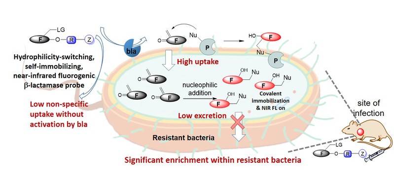 β-内酰胺酶在细菌中的表达是导致β-内酰胺抗生素耐药的主要原因,但同时也为在活体动物中监测细菌感染提供了独特机会。然而,由于动物活体本身是一个高度复杂、动态的环境,基于荧光探针对活体动物耐药细菌感染进行高质量成像仍然面临着诸多挑战。在本研究中,科研团队在前期亚甲基苯醌自锚定探针设计策略基础上(Chem. Sci. 2020, 11, 5889;Anal. Chem., 2020, 92, 15017;Angew. Chem. Int. Ed. 2024, 63, e202317773),发展出酶促多效应的β-内酰胺酶近红外荧光探针。该探针可以在β-内酰胺酶选择性促发下同时实现亲水-亲脂、共价键锚定、荧光开启等多重变化,使被酶激活的荧光分子高效富集在耐药菌中,从而实现在活体中对耐药细菌感染进行高质量、长时效荧光成像。相关研究对活体实时监测耐药细菌感染以及活体抗菌药物活性评估均具有重要价值。免费色情影片