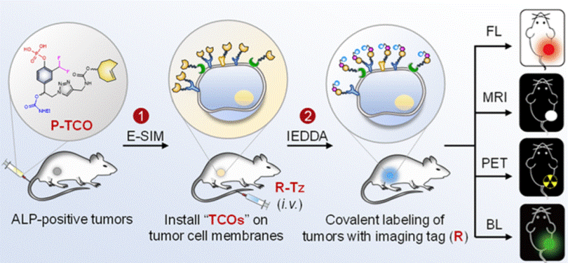 此外,谢贺新教授课题组与南京大学叶德举教授团队、江苏省原子医学研究所林建国研究员团队合作,在预靶向多模态活体动物肿瘤成像取得最新进展,相关成果以“Pretargeted Multimodal Tumor Imaging by Enzymatic Self-Immobilization Labeling and Bioorthogonal Reaction”为题发表在Journal of the American Chemical Society。该研究以研究团队前期发展的碱性磷酸酶自锚定探针(Chem. Eur. J. 2019, 25, 13994)为预靶向基团,通过亚甲基苯醌中间体的形成将反式环辛烯(TCO)选择性共价标记在活体动物肿瘤细胞膜上,进而通过快速的生物正交反应,将含有四嗪的各种信号报告基团(如荧光染料、磁纳米粒子、放射性核素、生物发光蛋白等)选择性富集在肿瘤细胞中,从而实现对活体小鼠肿瘤的高灵敏荧光、核磁共振、正电子发射断层及生物发光等多模态成像。南京大学博士研究生缪银杏、副研究员王宇琦、免费色情影片
