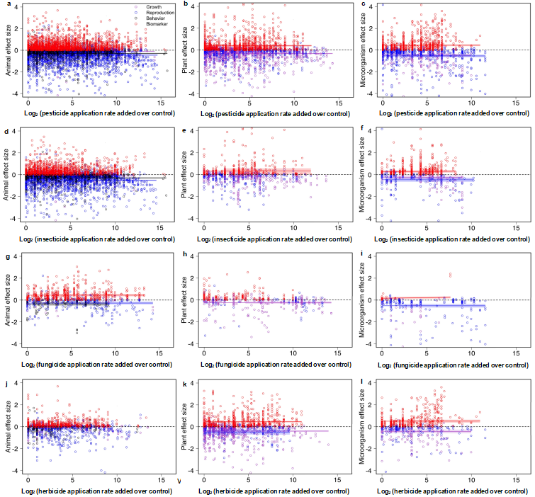 为防止过分夸大农药剂量对非靶标生物的负面影响,作者也构建了田间推荐使用农药剂量、水域推荐农药使用剂量如何影响非靶标生物的数据库,结果显示:尽管推荐农药使用剂量的数据样本量不如所有农药使用剂量(所有农药使用剂量包括:不高于推荐农药使用剂量和高于推荐农药使用剂量)的样本量,但将农药使用剂量固定在推荐剂量范围内,杀虫剂、杀菌剂、除草剂对非靶标动物、植物、微生物的负面效应仍旧出现。