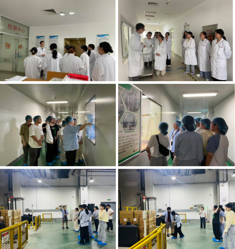 在技术团队的引导下,师生们探访了和黄药业的质量检验部、车间生产线与物流仓储系统。在质量检验部,负责人为同学们详细讲解了原料、辅料及包材等项目的理化检验流程与标准,以确保药品安全有效并符合法规要求。在生产车间,负责人介绍了药材称量、混合、切片等过程所需的设备,让同学们对药品生产过程中的质量把控有了直观认识。在立体式自动化仓库内,药品货架整齐排布,负责人现场展示智能出入库系统,展现了现代化物流仓储在药品管理中的精准与高效。参观过程中,同学们认真学习、积极提问,与技术人员进行交流与探讨。