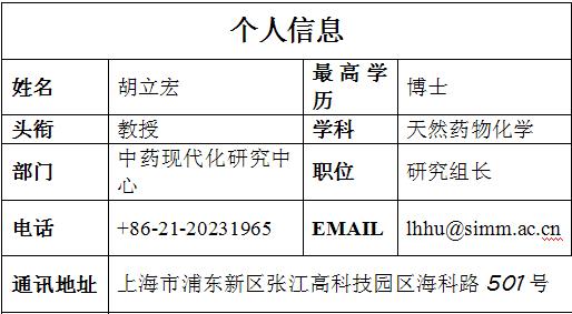 胡立宏,男,1969年12月生于浙江淳安。现为中国科学院上海药物研究所研究员、博士生导师。2009年获“国家杰出青年科学基金” 资助、入选中国科学院百人计划。主要从事基于中草药资源的药物发现研究,在中药药效物质基础、活性化合物的发现及其结构优化等研究中,取得了一系列系统的、创新的成果。如:与生物学家合作阐明了黄连降血糖、长春花的降血糖、绞股蓝的降血脂、牛蒡子的抗老年痴呆等的物质基础及其作用机制,在此基础上对中药有效成分进行系统的结构修饰,已发现多个药物候选物,其中抗肿瘤药物候选物F-XA7已实现技术转让。他以第一或通讯作者身份在在国际重要学术刊物上发表SCI论文180余篇,获得国内、国际授权发明专利10余项。曾获国家科学技术进步二等奖、上海市科学技术进步一等奖和上海市“优秀学科带头人”称号。