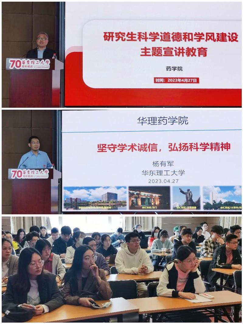 为强化研究生诚信科研意识,树立良好学术品德,营造院内优良的学风氛围,4月27日,药学院邀请杨有军教授开展题为“坚守学术诚信,弘扬科学精神”的研究生学术道德规范讲座,药学院副院长马磊、研究生辅导员及2022级研究生参与,本次讲座由马磊主持。