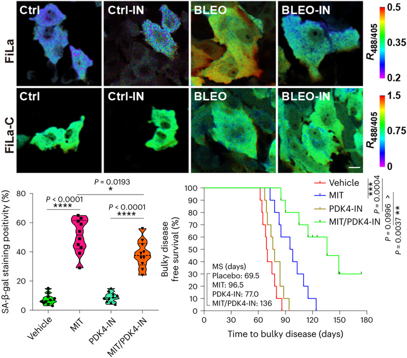 从分子和细胞层面揭示衰老发生的机制,找到延缓衰老的治疗靶点,是生物医学研究不懈追求的重要目标之一。本研究在分析衰老细胞的表达特征和代谢活性时,意外发现代谢调节酶PDK4在细胞衰老过程中显著上调。更加重要的是,临床化疗后期癌症患者病灶组织中PDK4的表达水平同微环境层面的细胞衰老直接正相关,并同化疗后阶段癌症患者的生存期呈显著负相关,这意味着PDK4具有十分重要的病理意义。研究团队综合利用前期研发的高性能细胞代谢荧光探针SoNar(Cell Metabolism2015, 21, 777;Nature Protocols 2016, 11, 1345)和FiLa(Cell Metabolism 2023, 35, 200)以及活细胞代谢监测成像技术,结合代谢流分析等方法,证实衰老细胞的糖酵解和三羧酸循环代谢都显著增强,尤其是乳酸产生显著增加。研究进一步发现前列腺癌微环境中的乳酸可以诱导肿瘤细胞的增殖、迁移和侵袭。PDK4特异性抑制剂PDK4-IN与化疗药物联合治疗,使肿瘤体积降低了75%,且不会引起严重的全身性细胞毒效应。组织学分析表明,PDK4抑制剂给药能阻断肿瘤微环境的细胞衰老进程。