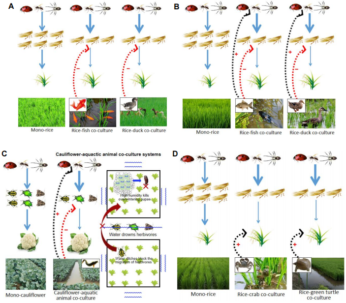 作物与人类驯养动物共存的物种多样性模式,是仅次于作物多样性模式的另外一种流行方式。例如,稻田养殖鱼虾蟹蛙鳖等稻渔共生模式,在东南亚国家已有2000多年的发展历史;菜田养殖水产动物,在近20年也得到了逐步发展;作物与家畜共存模式,已成为欧洲、北美洲、南非、澳大利亚以及新西兰等地区,发展现代农业的重要举措。虽然该共存模式的控害机制或理论鲜见报道,万年峰课题组在前期提出聚集假说(Journal of Applied Ecology, 2022)的基础上,在该文中又提出了另外3种假说:捕食假说(Predation hypothesis)、环境调控假说(Environmental regulation hypothesis)、作物抗性假说(Crop resistance hypothesis)(见图4)