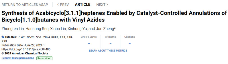 近日,我校药学院郑军课题组在国际权威学术期刊Journal of the American Chemical Society上发表题为“Synthesis of Azabicyclo[3.1.1]heptenes Enabled by Catalyst-Controlled Annulations of Bicyclo[1.1.0]butanes with Vinyl Azides”的研究论文,报道了课题组在催化剂调控双环[1.1.0]丁烷与α-烯基叠氮化物环化反应合成双环[3.1.1]庚烯的最新进展。