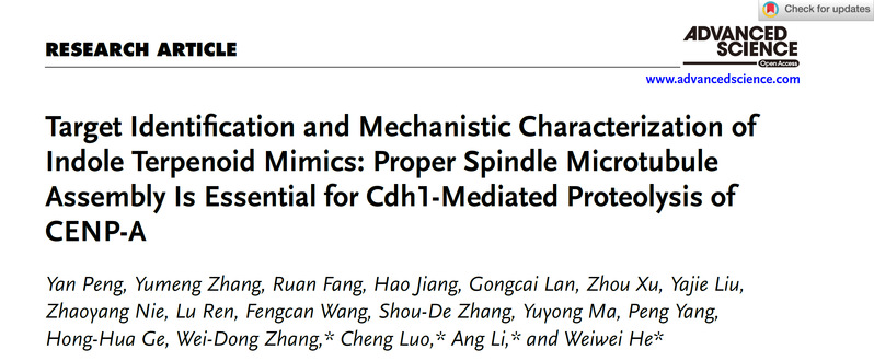 近日,我校药学院何薇薇课题组与中国科学院上海有机化学研究所李昂课题组、中国科学院上海药物研究所罗成课题组、海军军医大学张卫东课题组合作,利用吲哚萜模拟物作为工具,在有丝分裂保真性调控机制研究中取得新进展,相关成果以为题发表于Advanced Science期刊。