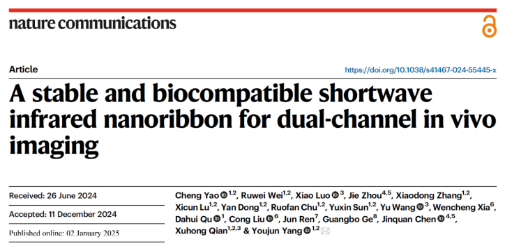 钱旭红院士、杨有军教授团队构建新型短波红外(SWIR)染料聚集体。该研究工作提出了一种晶体结构辅助的J聚集体的理性设计方法,对团队前期报道的ESi5近红外染料母体进行合理分子改造,成功构建一种水溶性好、稳定性好、吸收发射波长长且生物相容的染料聚集体,并成功实现小动物活体水平的双通道荧光/光声双模态成像。相关成果以 “A stable and biocompatible shortwave infrared nanoribbon for dual-channel in vivo imaging”为题发表在Nature Communications (Nature Communications, 16, 4, 2025)上。
