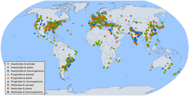 图1:农药影响非靶标生物的全球试验分布