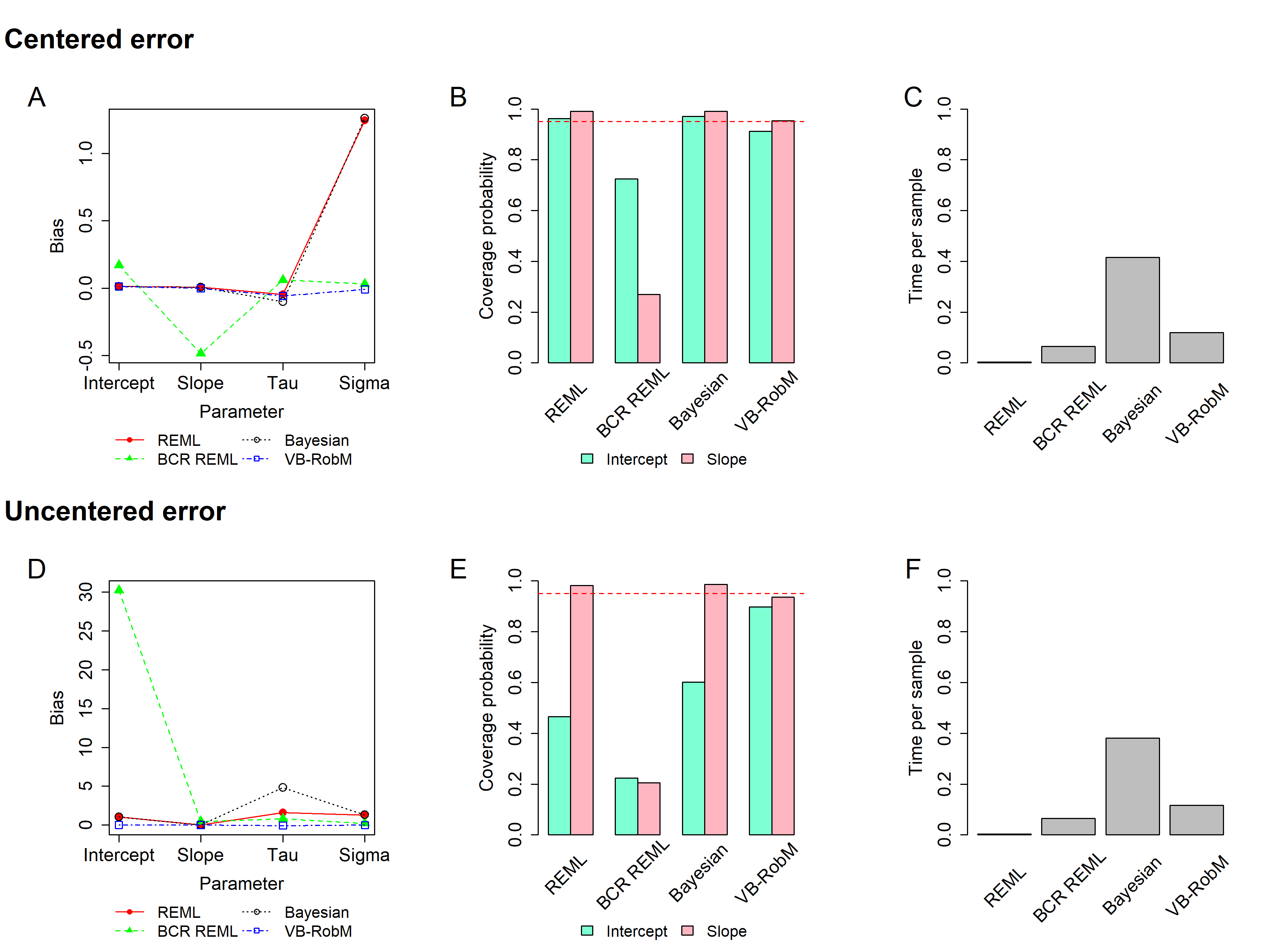 在模拟研究中,VB-RobM 在不同模拟场景下均展现出更低的参数估计偏倚、更优的置信区间覆盖率以及更短的计算时间。这表明,相较于传统的 SEM 方法,VB-RobM 具有更高的估计精度和更强的鲁棒性;而相比多元贝叶斯方法,它在保证准确性的同时大幅提升了计算效率。
