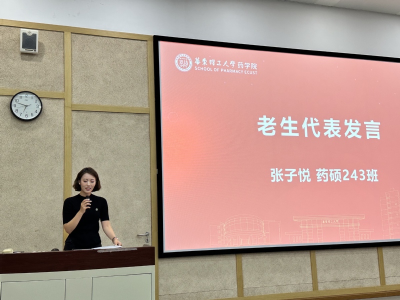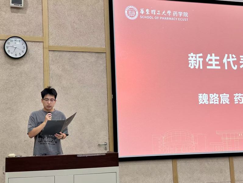 药硕254班魏路宸作为新生代表发言,号召全体新同学要肩负起新时代药学人的使命担当,在求知的道路上不断探索,在科研的征程中勇于创新,在服务人民健康的实践中砥砺前行,为推动我国医药产业高质量发展贡献青春力量。