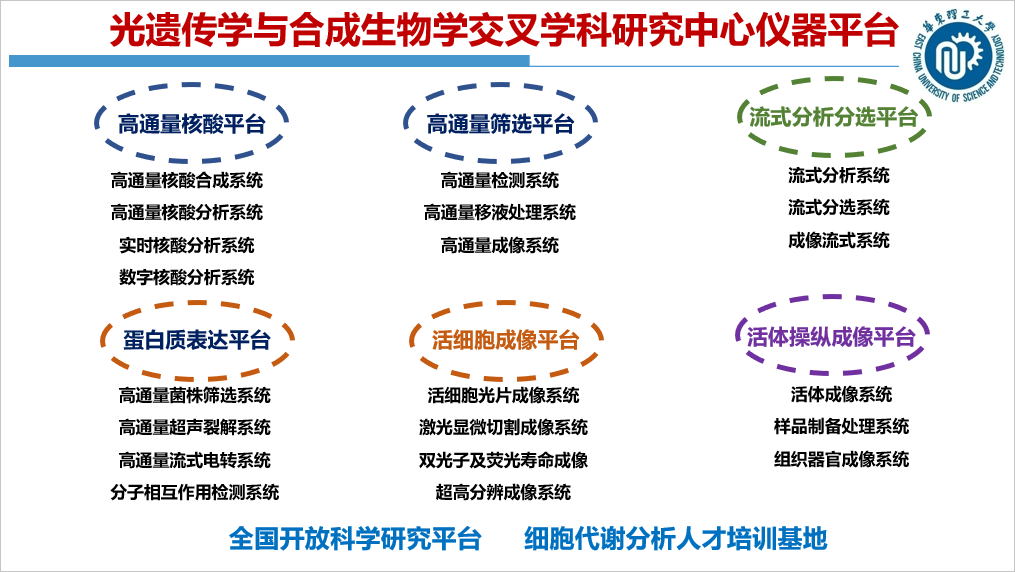 光遗传学与合成生物学交叉学科研究中心是华东理工大学筹建的首个前沿科学研究中心。研究中心总面积为1600平方米,拥有先进的生物光子学仪器平台、高通量筛选平台、细胞代谢研究平台、动物分析洁净室、斑马鱼房、蛋白质结晶室及生物样品库。中心拟围绕光遗传学与合成生物学前沿领域,发展细胞代谢监测与调控的高分辨、高通量原创技术,推动肿瘤、免疫、神经、发育等代谢相关领域的生命机制、疾病诊疗、药物发现与生物制造等前沿基础与应用转化研究。
